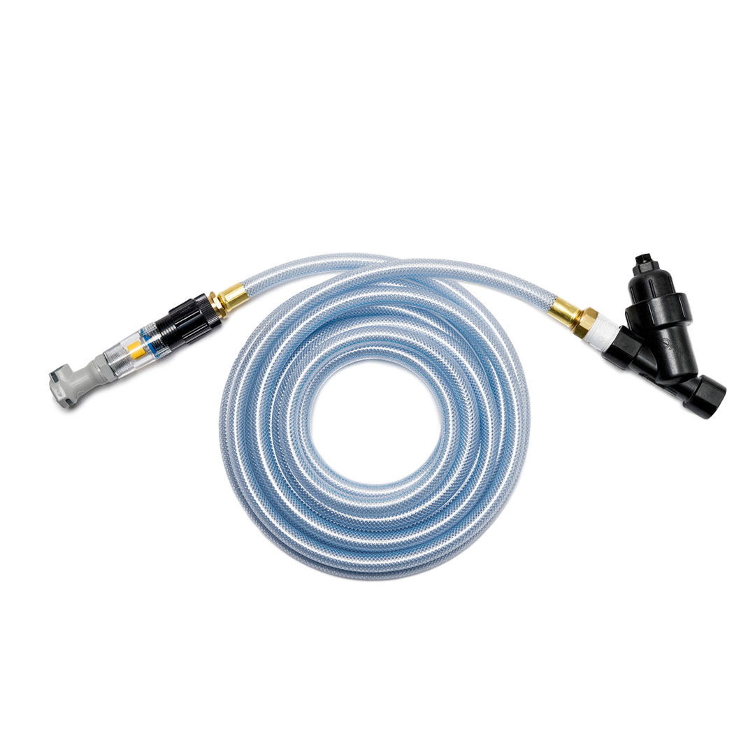The unit is comprised of an inline sediment filter, 20 feet (6.1 meters) of rugged industrial hose, a pressure regulator, a flow indicator (spinner) and a female Stealth Watering System connection. It requires a plumbing connection to a 3/4” NPT connection. An isolation valve is recommended to be installed at the source.